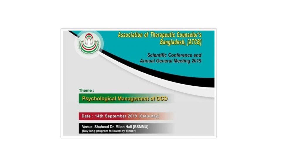 মানসিক স্বাস্থ্য সংশ্লিষ্টদের প্লাটফর্ম এসোসিয়েশন অব থেরাপিউটিক কাওন্সেলরস বাংলাদেশ ( এটিসিবি) এর বার্ষিক সাধারণ সভা ও বৈজ্ঞানিক সম্মেলন-২০১৯ আগামী ১৪ সেপ্টেম্বর (শনিবার) বঙ্গবন্ধু শেখ মুজিব মেডিকেল বিশ্ববিদ্যালয়ের শহীদ ডা. মিলন হলে অনুষ্ঠিত হবে।