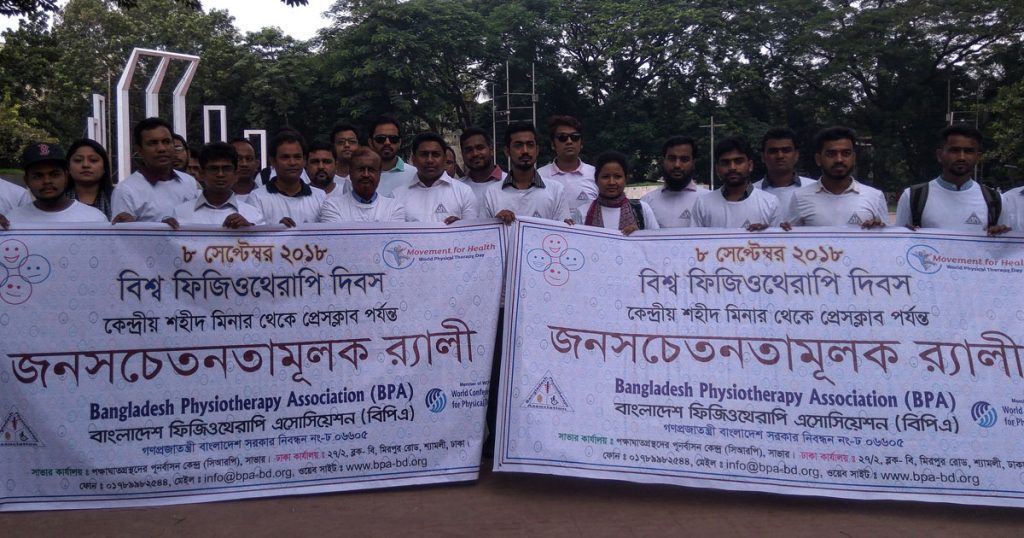 ‘বিষষন্নতা, উদ্বেগ ও মানসিক স্বাস্থ্যের উন্নয়নে ফিজিওথেরাপি’ প্রতিপাদ্য নিয়ে শনিবার (৮ সেপ্টেম্বর) পালিত হলো বিশ্ব ফিজিওথেরাপি দিবস-২০১৮। বিশ্ব ফিজিওথেরাপি নিয়ন্ত্রক সংস্থা ‘ওয়ার্ল্ড কনফেডারেশন ফর ফিজিক্যাল থেরাপি’ (ডাব্লিউসিপিটি) এর নেতৃত্বে বিশ্বের ১১৮ টি দেশের সঙ্গে দিনটি যথাযথ মর্যাদায় পালন করলো বাংলাদেশ। ‘বাংলাদেশ ফিজিওথেরাপি এসোসিয়েশন’ (বিপিএ) এ উপলক্ষ্যে দেশের বিভিন্ন জায়গায় র্যালি, ফ্রি হেল্থ ক্যাম্প, গোল টেবিল বৈঠকের আয়োজন করেছিলো।