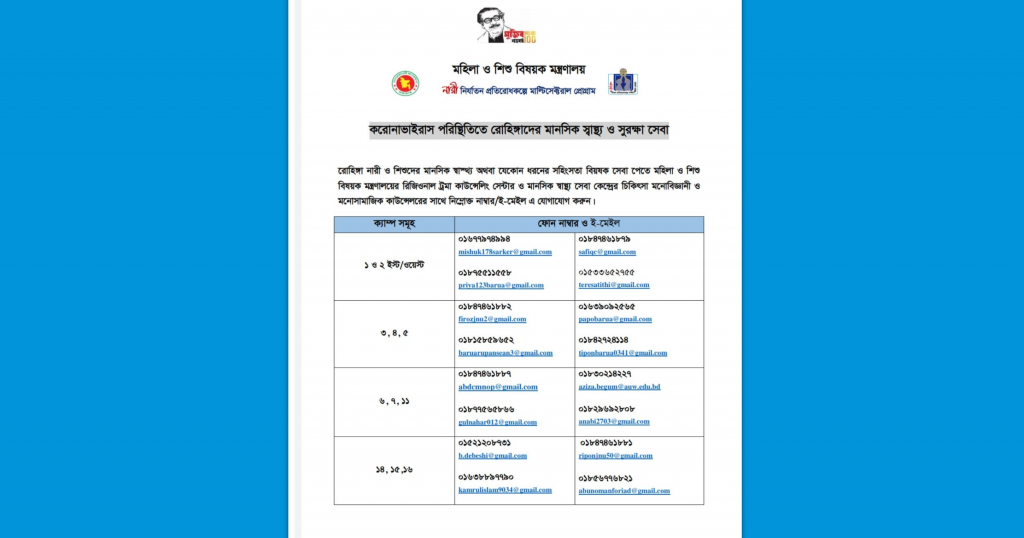 করোনাভাইরাস পরিস্থিতিতে রোহিঙ্গাদের জন্য বিশেষ মানসিক স্বাস্থ্য ও সুরক্ষা সেবায় বিশেষ কার্যক্রম পরিচালনা করছে মহিলা ও শিশু বিষয়ক মন্ত্রনালয়।