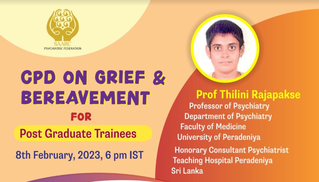 স্বজন হারানোর মানসিক বেদনায় দুঃখ লাঘবে পেশাজীবিদের জন্য পেশাগত দক্ষতা অর্জনে অনলাইন আত্মউন্নয়নমূলক কর্মশালার (CPD- কন্টিনিউয়িং প্রফেশনাল ডেভেলপমেন্ট) আয়োজন করেছে সার্ক সাইকিয়াট্রিক ফেডারেশন (এসপিএফ)।