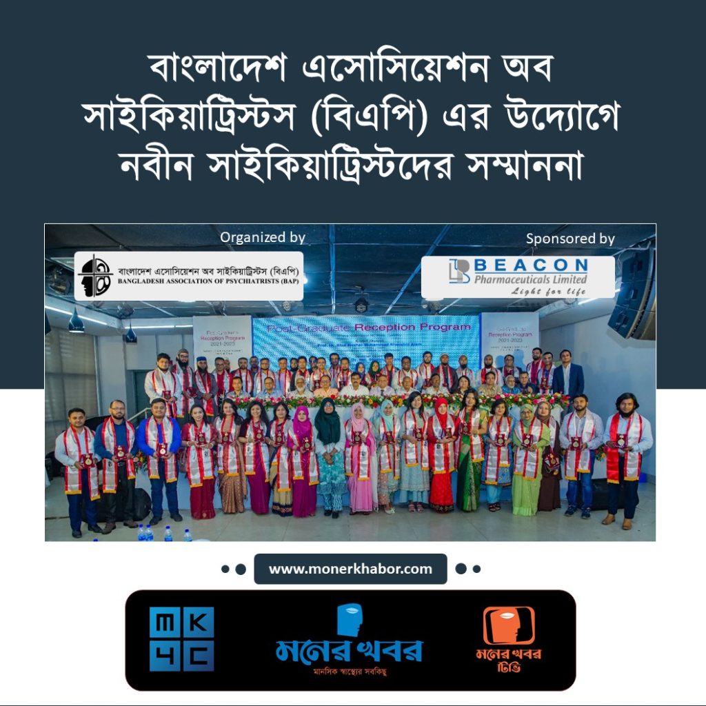 বাংলাদেশ এসোসিয়েশন অব সাইকিয়াট্রিস্টস (বিএপি) এর উদ্যোগে ২০২১ থেকে ২০২৩ সালের মধ্যে পাশ করা ৪০ জন নবীন সাইকিয়াট্রিস্টদের ৬ জুন (মঙ্গলবার) ঢাকা ক্লাবের স্যামসন এইচ. চৌধুরী সেন্টারে সম্মাননা প্রদান করা হয়।